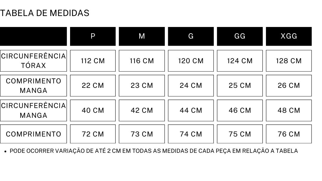 O modelo tem 78kg, mede 1,81m e veste tamanho G.